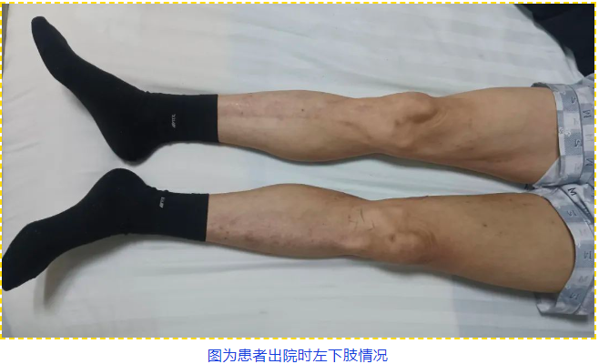 术中,手术团队发现患者左下肢膝关节处已经出现水泡,说明下肢静脉血栓堵塞进一步加重,立即通过下肢静脉造影精准定位血栓,以导管抽吸结合药物溶栓技术“双管齐下”清除血栓,同时置入下腔静脉滤器预防肺栓塞。历经2个多小时,手术团队们成功打通了闭塞血管,患者下肢血运即刻改善,青紫症状肉眼可见消退。经过术后5天抗凝及保守治疗,患者左腿基本恢复正常,目前患者已康复出院。