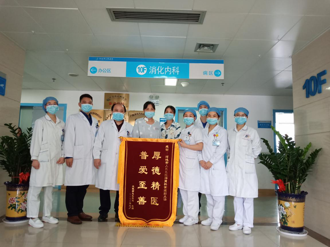 当时我院消化内科黄理副主任医师正在都安支援抗击疫情,与王女士的主管医生相识,通过联系将情况告诉给黄理副主任医师,随后黄理副主任医师立即联系了我院专家进行指导,通过两家医院的协调配合,并于当日顺利转院。经过我院的极力救治及护理,近日,王女士顺利康复出院。