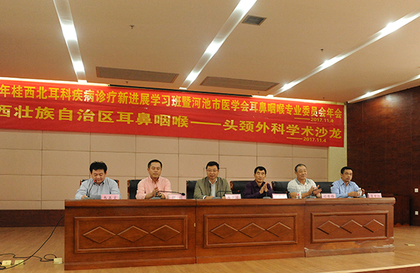广西耳鼻咽喉-头颈外科学术沙龙暨2017年河池市医学会耳鼻咽喉专业委员会年会于11月4日在市人民医院门诊综合楼23楼多功能厅顺利召开。广西区人民医院耳鼻咽喉科主任司勇锋教授,区人民医院耳鼻咽喉科张政教授、瞿申红教授、兰桂萍教授等专家前来参加会议,来自市内各县市医疗机构耳鼻咽喉科专家及相关医护人员共200余人参加会议。