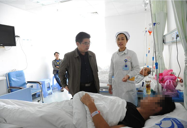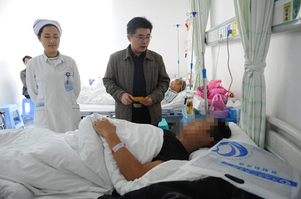 原来,患者覃先生因胸闷、心慌、气紧、呼吸费力,于2017年10月23日到心血管内科住院治疗,在住院期间突然出现面色苍白、大汗淋漓、全身发冷、呼吸困难,病情危急,值班护士发现后,立即报告主管医生进行抢救,科室主任周卓东、护士长罗丹,闻讯赶到病床积极参与抢救队伍中,一场与死神抢夺时间的战斗开始了,给氧、心电监护、建立静脉通道、西地兰静注.....整个病房空气都变得紧张,只有医护人员在争分夺秒地抢救病人,都到了下班时间,而科室的医护人员一个都没离开病房或下班回家,都坚持守护在患者身边。周主任不停地安慰鼓励患者,不要紧张,相信我们,也相信你自己,一定会没事的。随着药水一滴滴进入病人身体里,经过医护人员的精心治疗和坚持守护,患者转危为安。