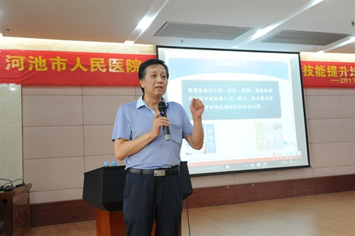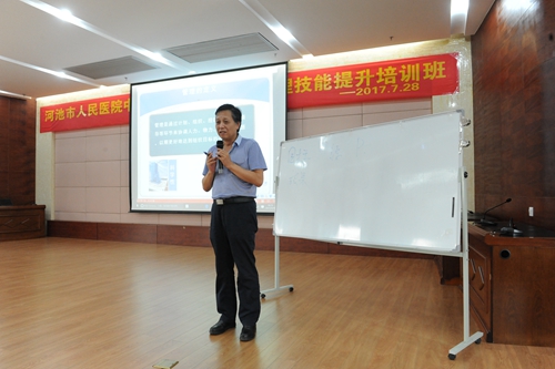 为进一步提高我院中层干部及科室骨干的综合素质,不断提升医院的管理水平和综合竞争力。7月28日,市人民医院在门诊综合楼23楼多功能厅举办医院中层干部及科室骨干管理技能提升培训班,知名医院管理专家刘燕翌教授受邀授课,全院中层干部、总住院医师、质控员以及各科室初、中、高级职称人员代表近300人参加培训,党政办主任韦师主持会议。