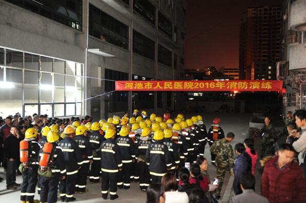 为加强医院消防安全,提高全院干部职工应急处理突发事件和防灾救灾能力,11月29日,我院联合河池市消防支队开展大型消防演练,全市共出动8辆消防车,50余名官兵参加此次夜间实战演练。