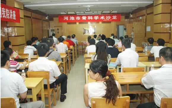当天下午,我院在学术报告厅举行了全市医院骨科学术沙龙,由钱本文教授对髋关节生物力学、“无柄髋关节” 置换新技术进行了讲学,与参会人员共同研讨了无柄髋关节置换新技术的临床应用及技术推广。来自河池市各县、市、区医院骨科主任及业务骨干76人参加了骨科学术沙龙及现场手术观摩。