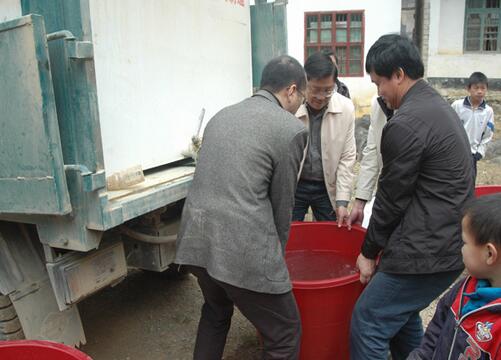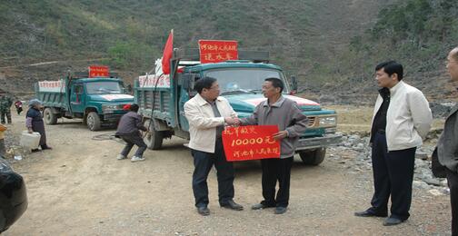 面对严峻旱情,河池市人民医院积极响应市委、市人民政府关于做好“三重三帮三保”抗旱救灾,确保群众生活用水的工作精神。3月25日市人民医院在郑军院长的带领下一行6人到凤山县砦牙乡东风村投入救灾工作,调出三辆抗旱送水专用车,15吨生活用水。同时捐送旱灾救灾款1万元送到灾民手中,以保证群众和学校师生必要的饮用水需求。