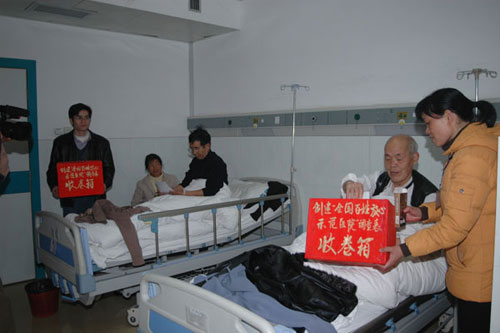 为顺利通过中国医院协会专家组的考核验收,我院领导高度重视,按照第三批创建医院考核工作的要求精心组织安排,广泛听取社会各界对医院的意见,自觉接受社会的监督,开展了一次把医院交给社会评价、交给百姓评判的大型自律活动。医院在门诊大厅和病区摆放了创建“全国百姓放心示范医院”宣传板报,悬挂了横幅、标语,并将活动情况在《河池日报》和医院宣传栏进行了公示。在门诊及病房显眼处设立患者投票箱,并于3月2日开始,组织有关工作人员向患者及家属发放问卷,并请上级卫生行政主管部门相关领导进行现场监督和指导,广泛征询和采纳患者及社会各界的意见和建议,加强医患沟通,密切医患关系,促进创建工作的开展。