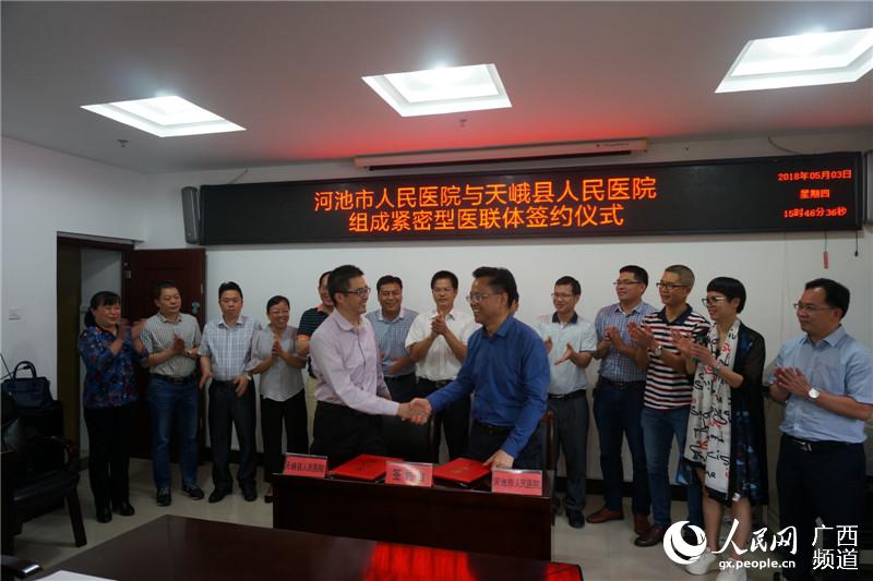 人民网河池5月10日电 5月3日,河池市人民医院与天峨县人民医院、南丹县中医院组建紧密型医联体签约仪式在天峨、南丹举行,河池市卫计委党组成员、市人民医院院长梁涛,河池市人民医院副院长唐秀革以及部分中层领导参加签约仪式。
