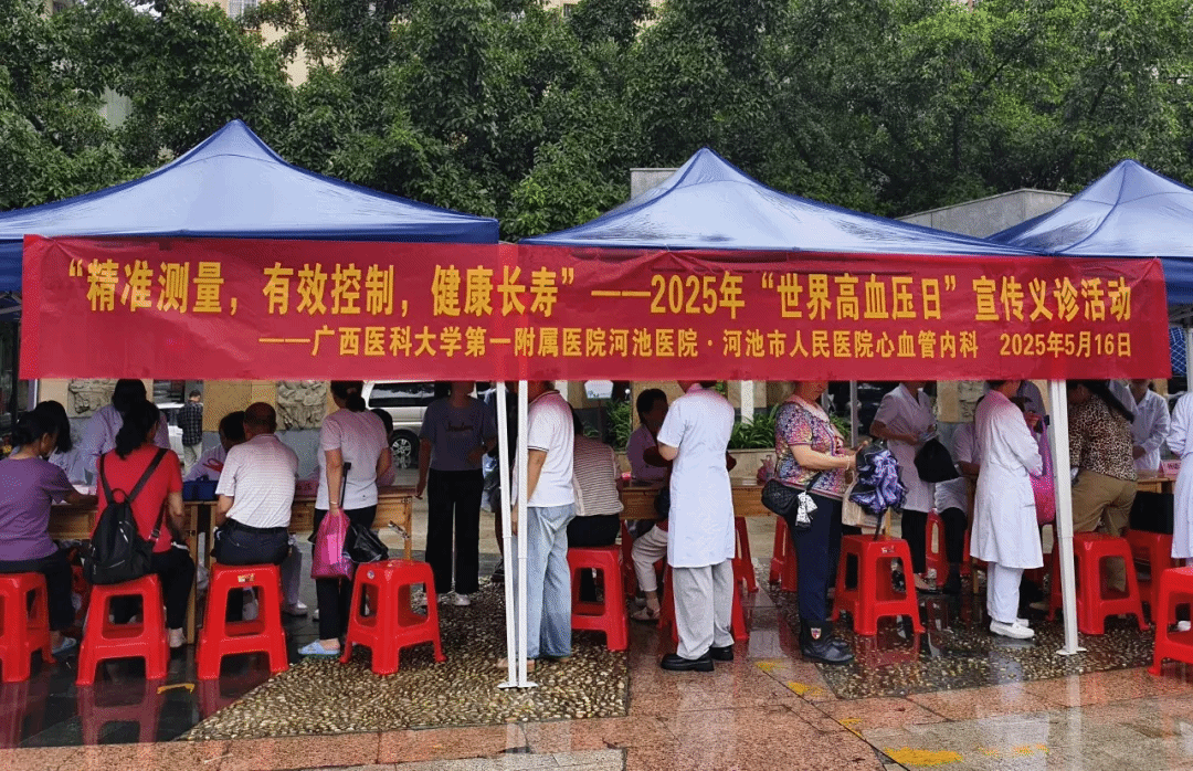 高血压被称为“无声的杀手”,可能引发心脏病等严重健康问题。2025年5月17日是第21个“世界高血压日”,主题是“精准测量,有效控制,健康长寿”。为提高群众对高血压的认识和重视程度,5月16日上午,广西医科大学第一附属医院河池医院·河池市人民医院心血管内科在金城江区文化广场开展“世界高血压日”宣传义诊活动。