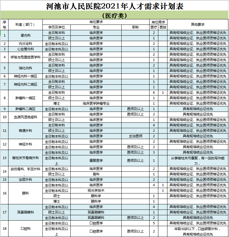 2、填写《河池市人民医院招聘人员报名登记表》,并将简历、身份证、学历证书、学位证书、专业技术资格证书、执业证书、住院医师规范化培训合格证等电子版发送至邮箱(rsk2281413@126.com)进行报名,并注明“学校+姓名+学历+专业+应聘科室”。具体面试时间另行通知。