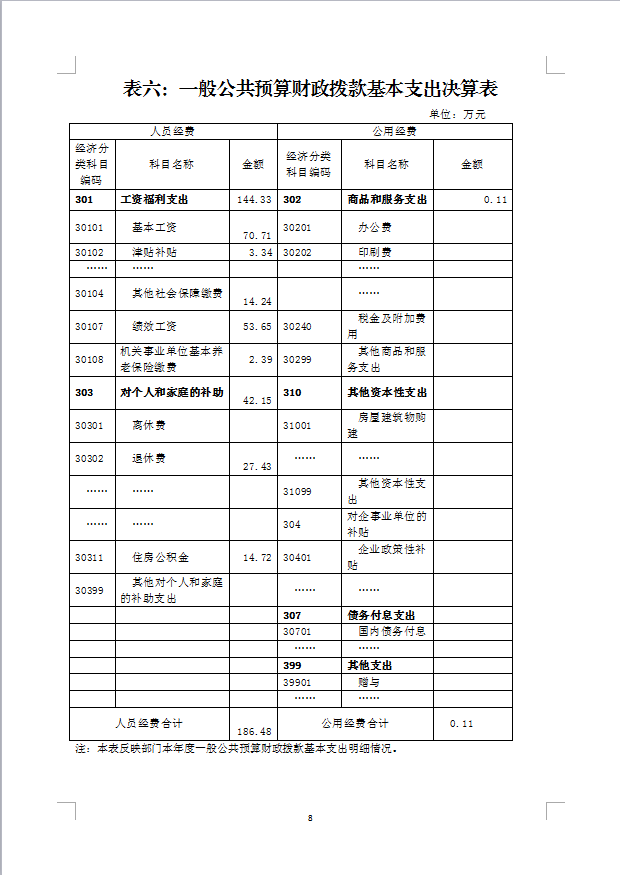 2016年度一般公共预算财政拨款基本支出186.59万元,其中:人员经费186.48万元,主要包括:基本工资70.71万元、津贴补贴3.34万元、其他社会保障缴费14.24万元、绩效工资53.65万元、机关事业单位基本养老保险缴纳2.39万元、退休费27.43万元、住房公积金14.72万元;商品和服务支出0.11万元,主要包括福利费0.11万元。
