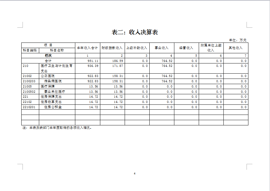 2.事业收入764.52万元,为事业单位开展业务活动取得的收入。主要是由传染病专科医院开展医疗服务所取得的收入。