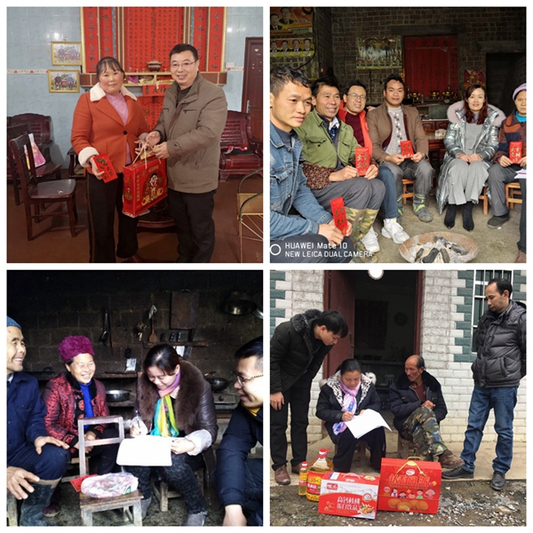 据了解,凤山县中亭乡的中亭村和柏林村是我医院定点帮扶村。2018年医院派驻工作队长、第一书记、驻村干部等6名同志,专职开展脱贫攻坚工作。年内医院主要领导带队到扶贫联系点7次,带领帮扶干部入户走访贫困户共256人次,对扶贫工作进展情况进行调研、指导、督查,取得了阶段性成效。截止2018年底,全乡减贫人口294户1224人。此次共51名干部入户走访,为贫困户送上慰问金及慰问品,鼓励他们克服困难,发展产业,增加收入,早日脱贫致富。