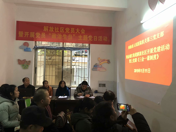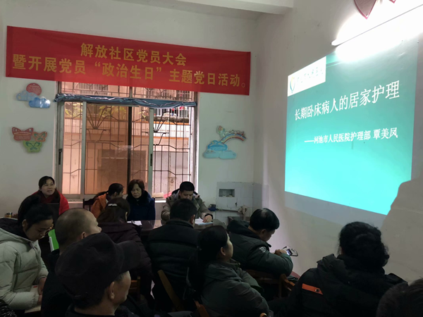 近日,我院机关第三党支部应金城江区解放社区的邀请,深入社区与群众开展专题党课学习活动,并向社区传授卫生健康知识。