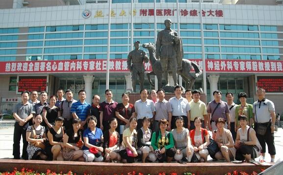 在延安大学附属医院大楼前与该院祁副院长合影留念