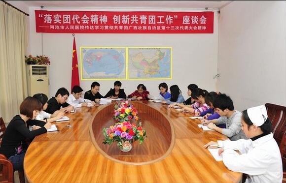 共青团广西壮族自治区第十三次代表大会于2012年9月8日至10日在南宁隆重召开,我院第三团支部书记、心内科护士、广西优秀共青团员获得者陈晓作为代表之一参加了该会。为学习领会第十三次团代会精神,进一步做好医院共青团工作,9月21日下午,院团委召开“落实团代会精神,创新共青团工作”座谈会。医院党委书记陆艳姣、党委副书记、纪委书记杨立倩、院团委书记韦师、院团委副书记蓝图以及以陈晓为代表的10余名青年团干部参加了座谈会,会议由院团委书记韦师主持。