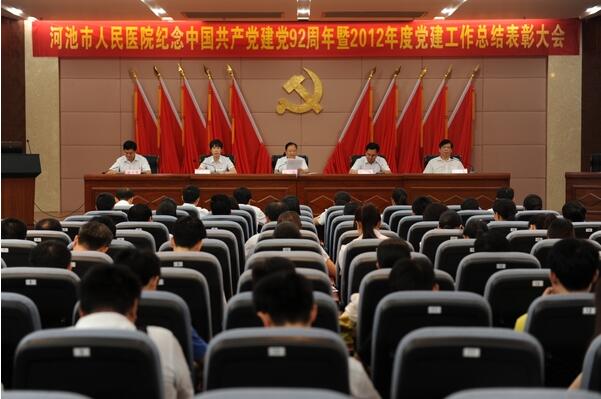 6月28日下午,我院纪念建党92周年暨2012年度党建工作总结表彰大会在门诊综合大楼23楼多功能报告厅举行。陆艳姣书记、梁涛院长、杨立倩副书记、谭俊扬副院长、工会潘立举主席出席大会。各党支部委员、党员、入党积极分子,全院中层干部,团委委员,受表彰的先进集体和优秀个人代表,共300余人参加了大会。会议由医院党委副书记、院长梁涛主持。