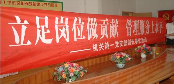 自医院开展创先争优活动以来,机关第一党支部针对机关行政职能科室特点,精心设计安排,创新活动载体,认真抓好落实,推动了创先争优活动的良好开局,取得了初步成效,为医院各项工作的创新突破提供了有力保证。为进一步营造浓厚的创先争优氛围,促进创先争优理念更加深入人心,9月19日,机关第一党支部召开支部党员大会,就创先争优活动进行再动员部署,并举行了以 “立足岗位做贡献 管理服务上水平”为主题的创先争优党员公开承诺签名仪式。支部全体党员以及对口团支部委员参加了此次签名承诺仪式。支部书记韦师主持会议,并就支部深入开展创先争优第二阶段活动作了动员部署。