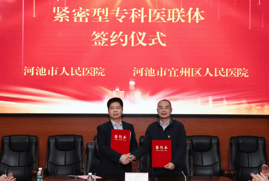 3月25日,广西医科大学第一附属医院河池医院·河池市人民医院与宜州区人民医院举行消化内科紧密型专科签约仪式暨党建医联体座谈会。河池市人民医院党委书记刘仁高、副院长韦仁杰,宜州区人民医院党委书记廖东铭、院长黄东及双方医院相关人员出席活动。