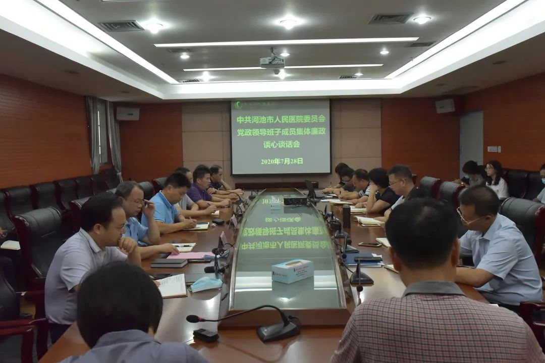 2020年7月28日,河池市人民医院召开党政领导班子成员集体廉政谈心谈话会。河池市卫生健康委员会党组书记、主任韦东禄,河池市纪监委派驻市卫生健康委纪检组组长欧红明出席会议。会议由医院唐秀革院长主持。医院党政领导班子成员、党委委员、各党支部书记和重点部门负责人共40余人参加会议。